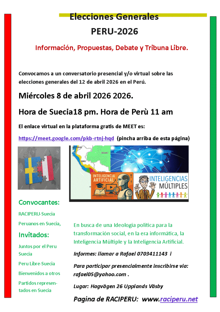 El proyecto RACIPERU-Suecia es un intento de usar Internet para el cambio hacia una sociedad mas justa en armonía con la naturaleza. Indudablemente todo proyecto tiene una vision que es una base fundamental. Si quieres conocer nuestra vision pincha el siguiente enlace del menu.